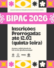 Descrição da Imagem: Cartaz digital com fundo em tom bege e elementos gráficos coloridos em rosa, amarelo, preto e branco. No topo aparece o título “BIPAC 2026”. Ao centro, em destaque, o texto informa: “Inscrições prorrogadas até 12.03 (quinta-feira)”. Abaixo, lê-se: “Acesse o edital através do link na bio @culturaunespar”. O cartaz é decorado com formas geométricas e ícones relacionados às artes, como olho estilizado, máscaras de teatro, estrela, flores e tamborim, organizados em uma grade colorida. Na parte inferior aparecem os logotipos da BIPAC, Diretoria de Cultura, PROEC e Unespar.